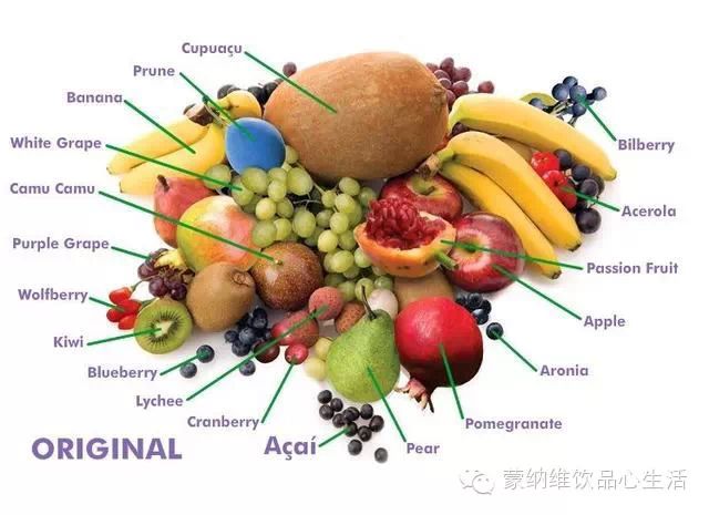 特别精选了多种对维持身体最需要的营养素的水果混合配置,其中包括有:巴西莓、白葡萄、苹果、西印度樱桃、野樱莓、紫葡萄、蔓越莓、百香果、西梅、奇异果、蓝莓、枸杞、卡姆果、石榴、荔枝、梨子、香蕉、古布阿苏树果和越桔。